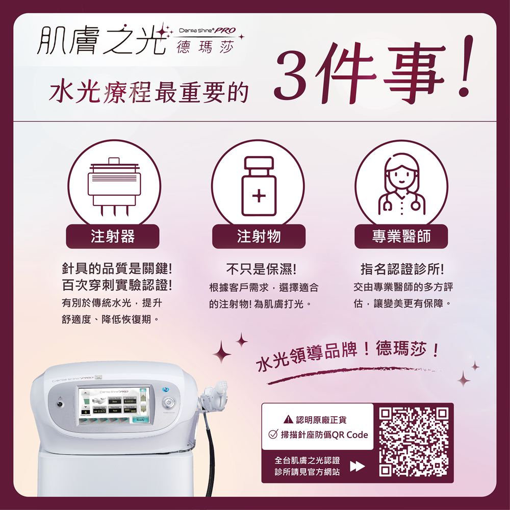 德瑪莎(Dermashine)是近年來醫美界備受關注的水光注射系統,它透過精準的技術將玻尿酸、維生素等營養成分直接注入肌膚深層,達到快速且有效的保濕、緊緻、亮白效果。