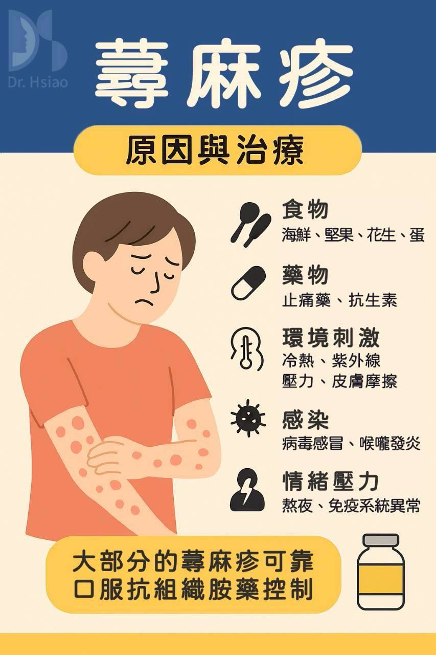 大部分的蕁麻疹可以靠口服抗組織胺藥(抗過敏藥)控制,其止癢效果很好。嚴重時醫師會短期使用類固醇來快速壓制發炎。慢性蕁麻疹則需要長期追蹤,有些會使用第二代抗組織胺、免疫調節劑或生物製劑治療。要注意的是,別自己亂抓或塗不明藥膏,以免狀況越來越糟。