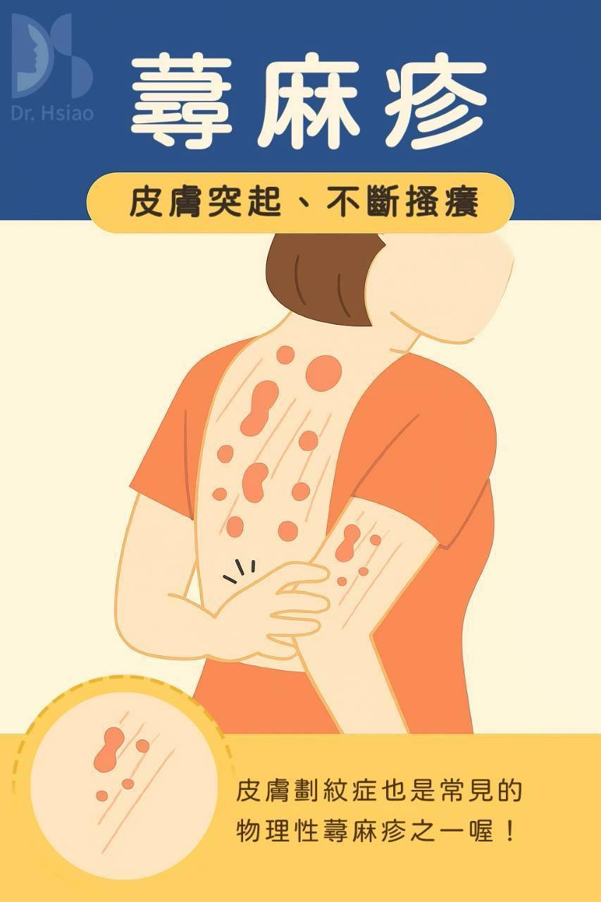 蕁麻疹是一種皮膚過敏反應。典型蕁麻疹的症狀是,皮膚突然出現一塊一塊紅腫、癢得要命的疹子,像是被蚊蟲咬了一大片,抓了又變更多。它來得快、退得也快,通常在幾分鐘到幾個小時內會自己消退,不會留下疤。但有些人會一整天反覆冒出來,也有人在幾週甚至幾個月內連續發作,也就是所謂的「慢性蕁麻疹」。