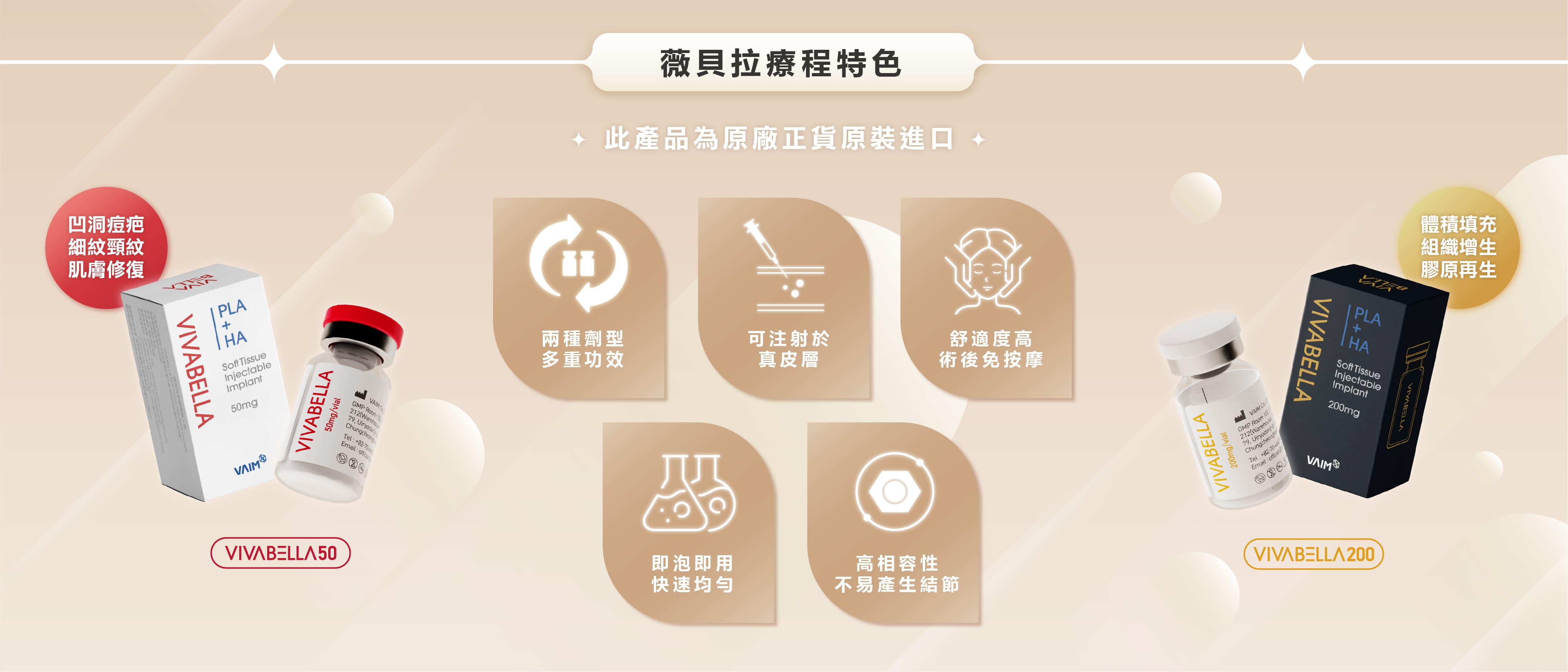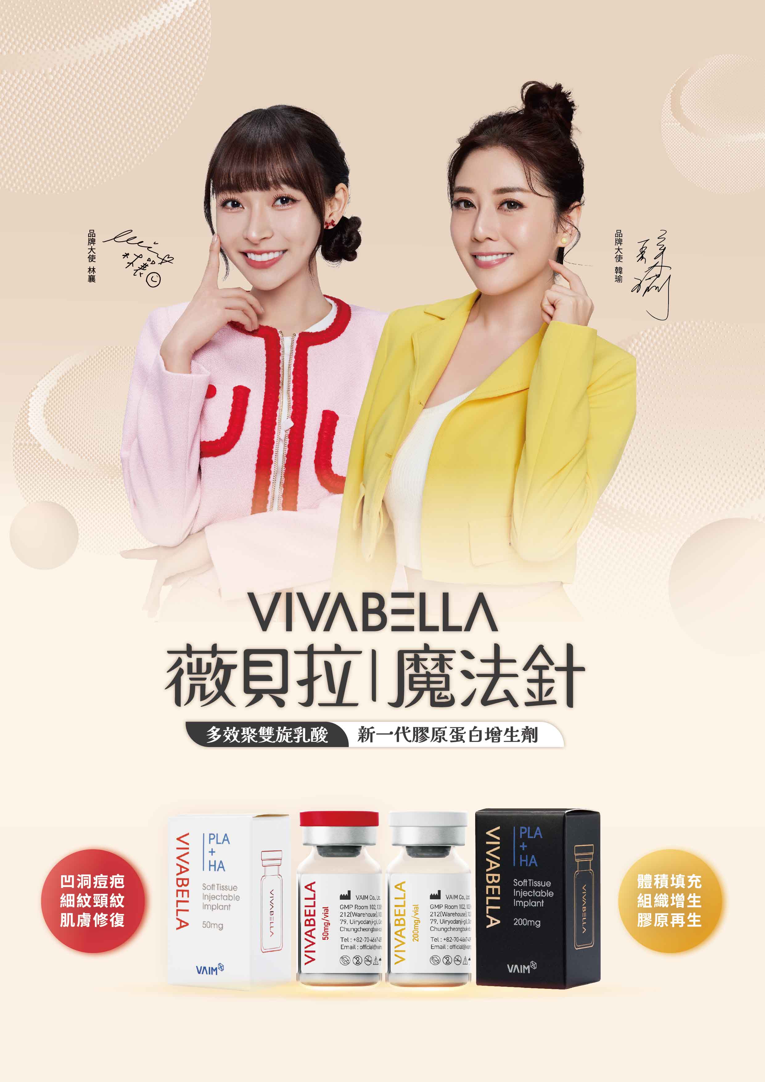 薇貝拉(Vibella),俗稱「魔法針」,它結合了「玻尿酸」的即時填充效果與「聚雙旋乳酸(PDLLA)」的長效膠原蛋白增生特性,能即刻填充凹陷並刺激自體膠原蛋白增生。因不易產生結節、無需按摩、效果自然且舒適度高。
