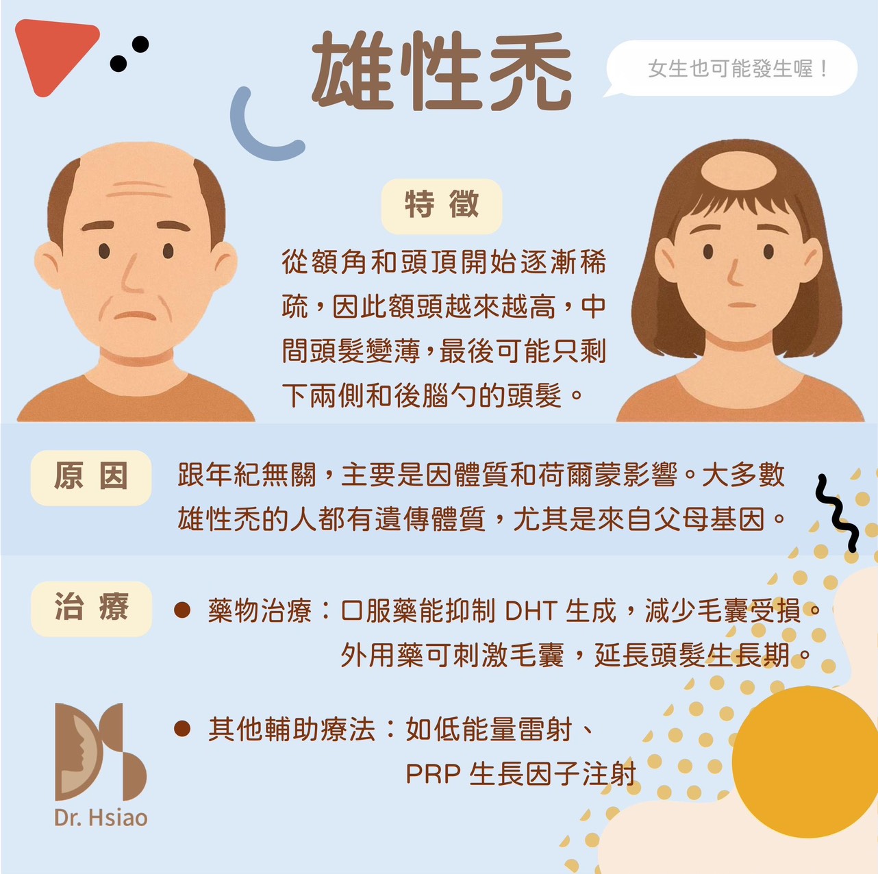 雄性禿其實不只男生會有,女生也可能發生,只是比較少、較不明顯。它跟年紀無關,主要是因體質和荷爾蒙影響。大多數雄性禿的人都有遺傳體質,尤其是來自父母的基因。有這種體質的人,頭皮的毛囊對雄性激素(DHT,二氫睪固酮)特別敏感,導致毛囊逐漸縮小、頭髮越長越細、最後掉光。